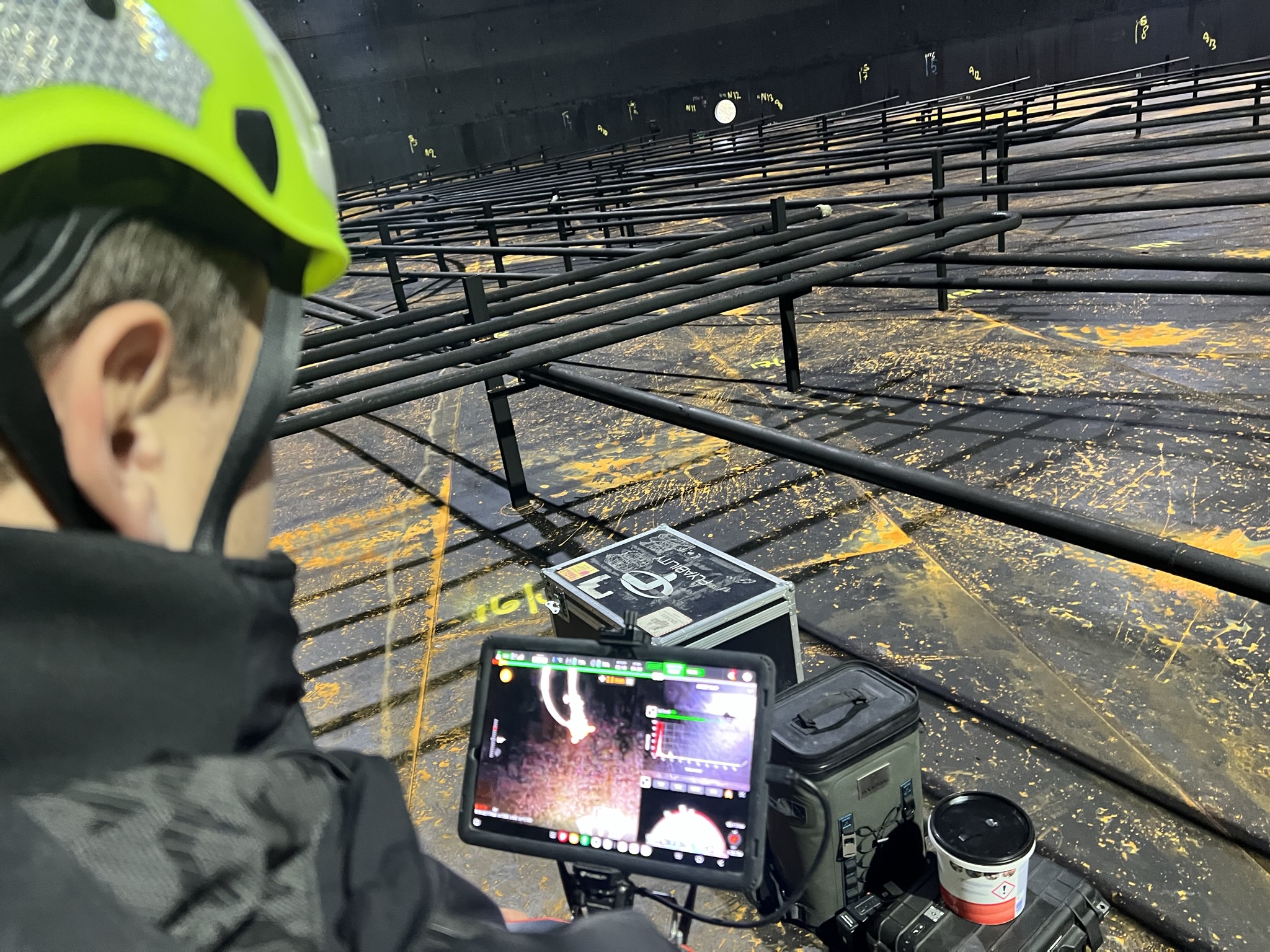 Drone Eksperten deployed our Elios 3 drone equipped with a UT payload to perform ultrasonic thickness measurements directly inside the tank.